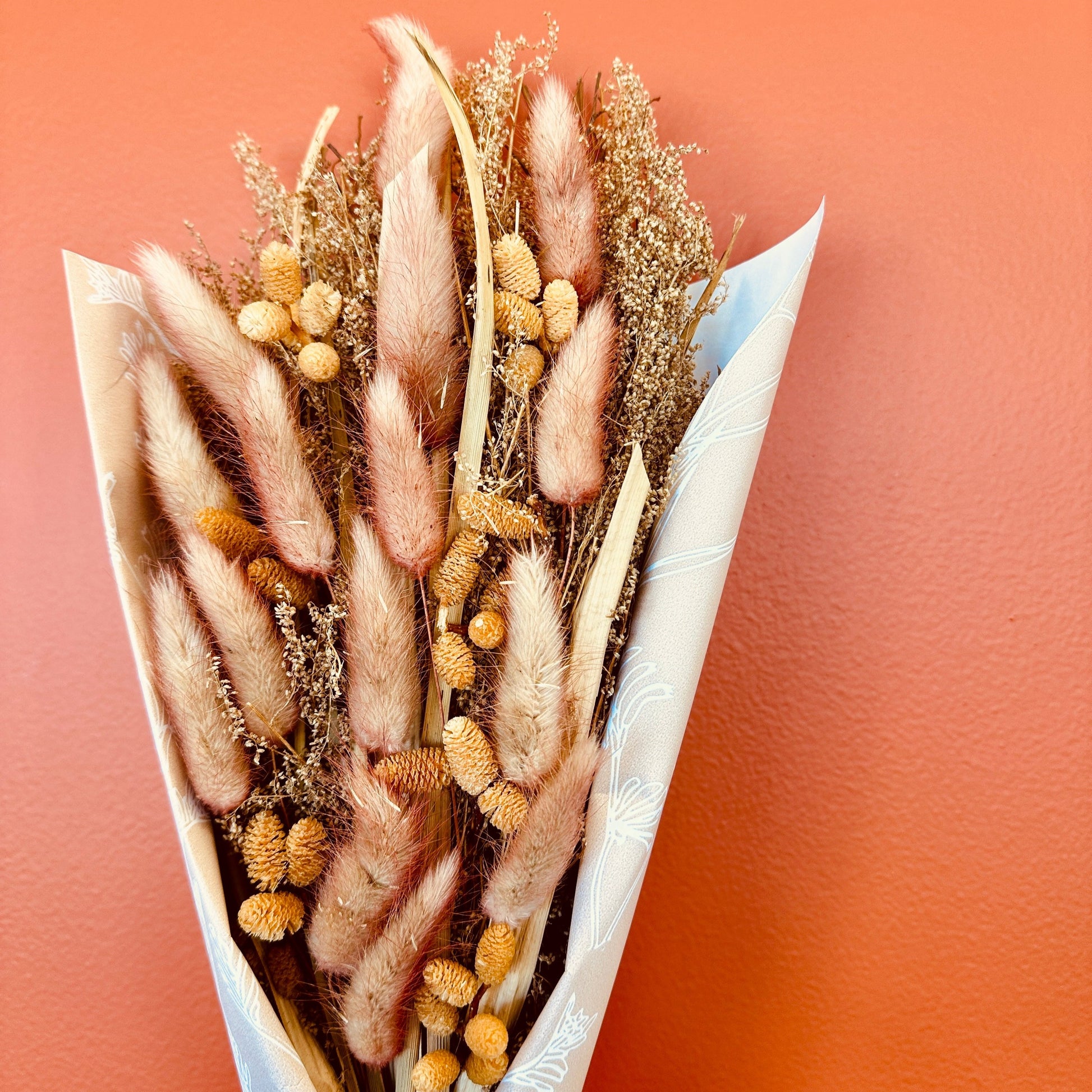 Preserved and dried flower bunch of flowers in a neutral colour way with a soft pink access.