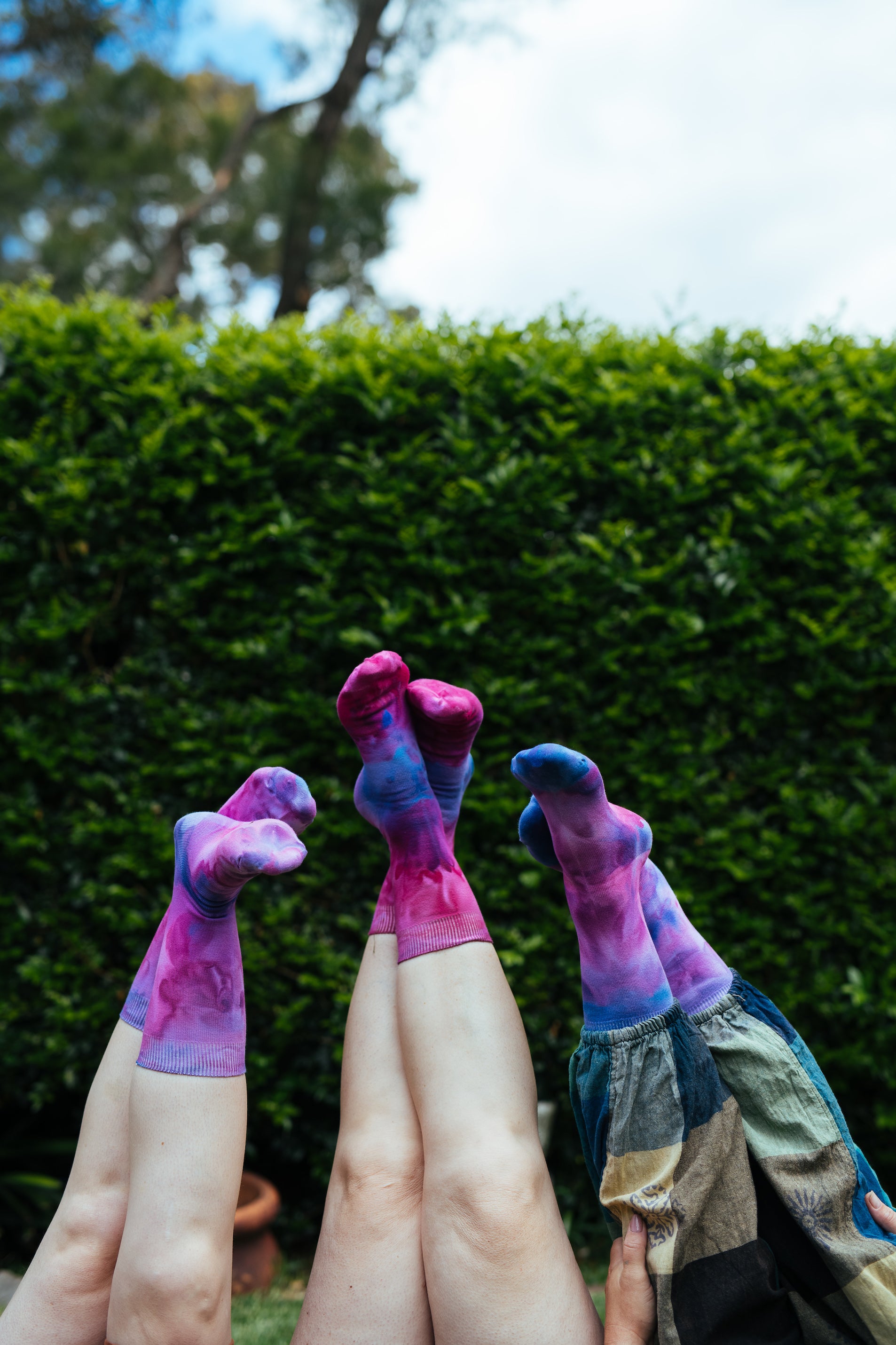 Each pair of socks is individually hand-dyed using the magic of ice, dye and time. This process ensures that no two pairs are alike, making every pair of socks totally unique.